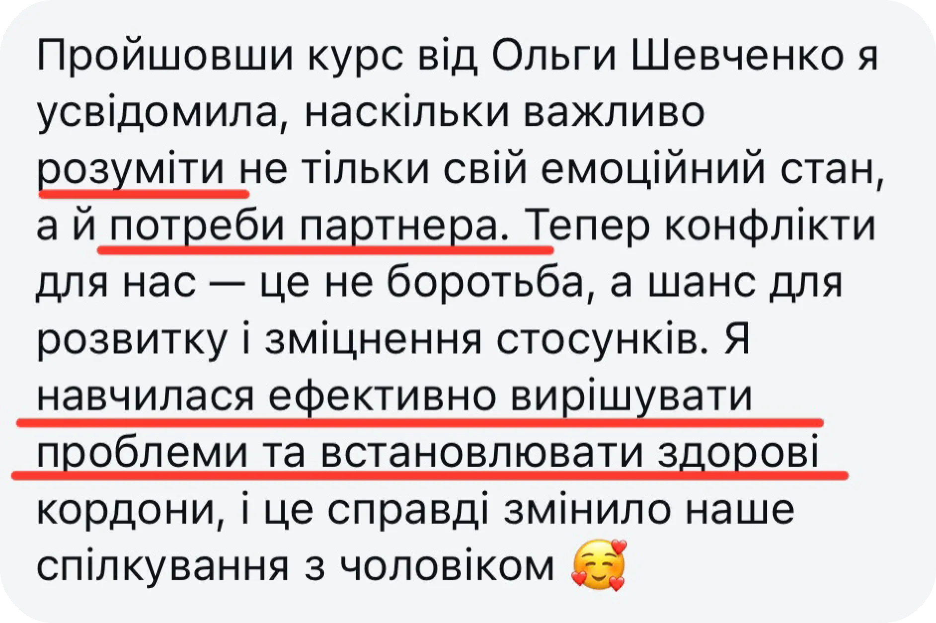 отримаєте навички конструктивного обговорення проблем без емоційної напруги, ігнорування чи відкладення питань